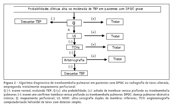 Um abrangente estudo encontrou que a presença de DPOC não afetou o desempenho diagnóstico das probabilidades clínicas dos dímeros-D, da TCH e da angiografia pulmonar por cateter.(44) Quanto ao estudo V/Q, embora maior número de mapeamentos não diagnósticos possa ser esperado na presença de DPOC, ele se mostrou um teste útil em pacientes com DPOC e suspeita de TEP.