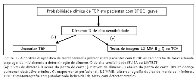 A probabilidade clínica de TEP aguda em pacientes com DPOC grave pode, mais freqüentemente, ser considerada moderada. O estudo do mapeamento perfusional resulta também, mais provavelmente, intermediário (não diagnóstico). Nestas condições tem sido proposto como teste diagnóstico inicial a ultra-sonografia dos membros inferiores e, na negatividade deste, a TCH (Figura 1).(20-21,29,48-49) Sempre que disponível, o mapeamento perfusional pode ser útil para o diagnóstico quando normal/quase normal, ou de alta probabilidade, mesmo em pacientes com DPOC (Figura 2). Em casos de probabilidade clínica baixa, o teste de dímeros-D negativo (de alta sensibilidade) pode afastar o diagnóstico (Figura 3).