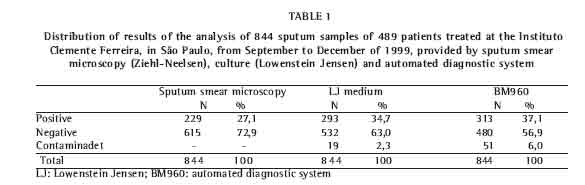 Between September and December 1999, 851 sputum samples of patients were examined in the Mycobacteriology Laboratory of the Instituto Clemente Ferreira in the city of São Paulo. Smear microscopy for acid-fast bacilli was performed using the Ziehl-Neelsen method (on LJ medium) and the BM960 oxygen consumption monitor system (BACTEC MGIT 960; Becton Dickinson, Sparks, MD, USA). A total of 7 samples were excluded after being identified as nontuberculous mycobacteria.