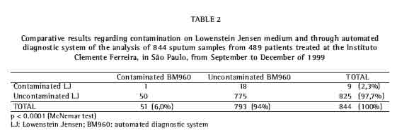 Since it utilizes a medium richer in nutrients, the oxygen consumption monitor system tends to present higher contamination rates than does the LJ solid medium, as evidenced by the fact that, in the present study, we found a significantly higher contamination rate in the oxygen consumption monitor system medium (5l/844) than on LJ medium (19/844). There are studies in the literature, such as the one by Chien et al.(20), in which no such difference was found. This discordance may be related to the characteristics of the clientele treated in the center, where chronic patients, protracted diagnoses and extensive lesions may facilitate contamination.