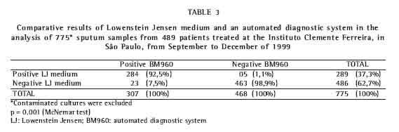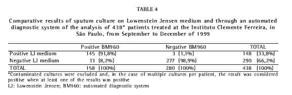 In the case of more than one culture per patient, the result was considered positive when at least one culture was positive and negative only when all were negative. With regard to the 161 patients diagnosed from culture (158 positive in the oxygen consumption monitor medium and 3 positive on LJ medium), the samples were typified and the charts were assessed and found to be in accordance with the diagnosis of pulmonary TB. The 3 samples in disagreement presented smear microscopy that was positive in 2 cases and negative in 1 case (Table 4).