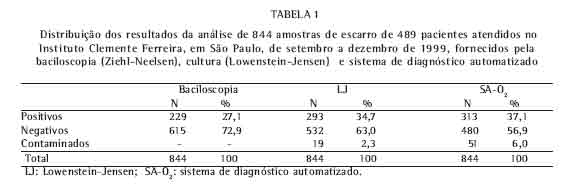 Entre setembro e dezembro de 1999, 851 amostras de escarro de pacientes foram examinadas no Laboratório de Micobacteriologia do Instituto Clemente Ferreira, na cidade de São Paulo, pela baciloscopia para bacilos álcool-acidorresistentes segundo o método de Ziehl-Neelsen, semeadas no meio de LJ e no sistema SA-O2. Sete amostras foram excluídas por se tratar de micobactérias não tuberculosas.