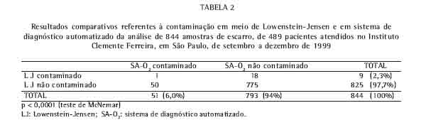 Em relação aos exames contaminados, 19 ocorreram no LJ (2,3%) e 51 no SA-O2 (6,0%), sendo maior neste último, o que foi estatisticamente significativo (p < 0,0001, teste de McNemar) (Tabela 2).