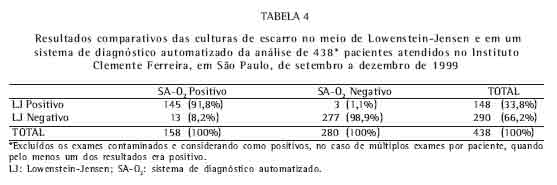 No caso de mais de um exame por paciente, o resultado foi considerado positivo quando pelo menos um deles foi positivo e, negativo, quando todos foram negativos. Com relação aos 161 pacientes diagnosticados a partir de cultura (158 positivos no SA-O2 e 3 positivos no LJ), as amostras foram tipificadas e os prontuários avaliados e concordantes quanto ao diagnostico de tuberculose pulmonar. As 3 amostras discordantes apresentaram baciloscopia positiva em 2 casos e negativa em 1 deles (Tabela 4).