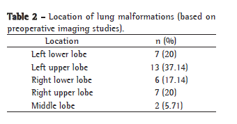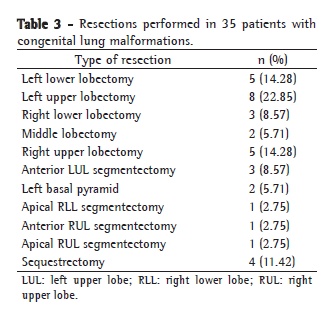All of the patients had been submitted to some type of imaging test for the preoperative diagnosis: 28 (80%) had been submitted to chest CT; 35 (100%) had undergone routine chest X-ray; and only 4 (11.42%) had been prenatally diagnosed by ultrasound (3 cases of CAM and 1 case of extralobar pulmonary sequestration). The locations of the lesions are described in Table 2, and the types of resections are shown in Table 3.