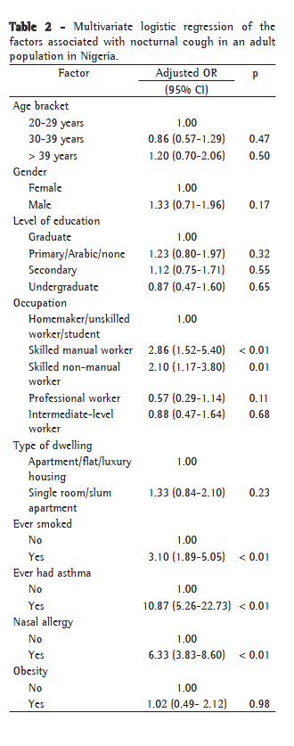 Objetivo: Determinar os fatores associados à tosse seca, tosse produtiva e tosse noturna entre jovens adultos na Nigéria. Métodos: Foram avaliados 498 indivíduos com 20-44 anos de idade em Ilorin, Nigéria, utilizando-se o questionário European Community Respiratory Health Survey (ECRHS), administrado por entrevistadores treinados. Resultados: A tosse noturna apresentou associações com asma (OR = 10,87; p < 0,01), alergia nasal (OR = 6,33; p < 0,01), tabagismo (OR = 3,10; p < 0,01), trabalho manual e trabalho não manual especializados (OR = 2,86 e 2,10, respectivamente; p < 0,01 para ambos) e gênero feminino (OR = 1,33; p = 0,17). A tosse produtiva apresentou associações com trabalho manual e trabalho não manual especializados (OR = 3,82 e 3,03, respectivamente; p < 0,01 para ambos), tabagismo (OR = 3,10; p < 0,01), asma (OR = 3,27; p < 0,01) e alergia nasal (OR = 5,81; p < 0,01). A tosse seca apresentou associações com asma (OR =5,18; p < 0,01) obesidade (OR =1,88; p = 0,19), tabagismo (OR = 1,77; p = 1,44), alergia nasal (OR = 1,45; p = 0,26) e gênero feminino (OR =1,36; p = 0,33). A idade, o gênero, o tipo de residência e a obesidade não se associaram significativamente a nenhum tipo de tosse (p > 0,05). Conclusões: A prevenção precoce e o tratamento de condições associadas à tosse, assim como a modificação de fatores sociais comumente associados à tosse, são necessários a fim de reduzir a morbidade respiratória.