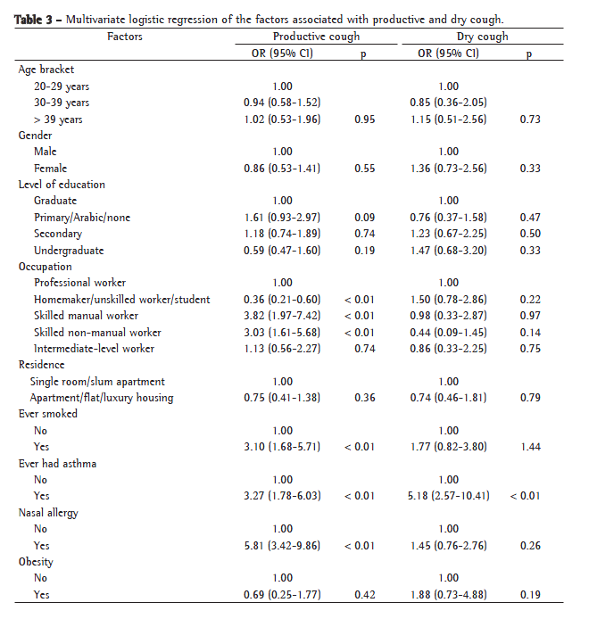 ResultsWe enrolled 498 subjects, of whom 300 (60.2%) were male and 198 (39.8%) were female. In the sample as a whole, the mean age was 30.8 ± 6.7 years. Of the 498 subjects, 136 (27.3%) reported nocturnal cough and 362 (72.7%) reported no nocturnal cough (p < 0.001), whereas 80 (16.0%) reported productive cough and 48 (9.6%) reported dry cough. Among the subjects who reported cough, the mean age was 31.0 ± 7.0 years (Table 1). The multivariate logistic regression showed that subjects who had ever had asthma were eleven times more likely to have nocturnal cough, those with nasal allergy were six times more likely to have nocturnal cough, and those who had ever smoked or had engaged in skilled manual work were three times more likely to have nocturnal cough. Subjects who were between 30 and 39 years of age were more likely to report nocturnal cough, as were those who were female, those who had only a primary school education and those living in a single room or in a slum apartment, although the differences were not statistically significant (Table 2). Skilled manual workers were four times more likely to report productive cough.