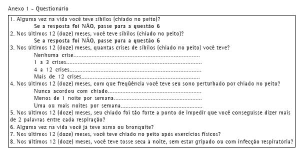 Embora o questionário aparente ser bom para identificação de asmáticos, pouco serve para avaliar a relevância clínica e a incapacidade do paciente, o que é importante em pesquisas epidemiológicas para estimativa de custo ou de gravidade. A adição de questões, mantendo-se o questionário original intacto, como as relativas ao uso de medicação, data do início dos sintomas, chiado na ausência de gripe e bronquite alguma vez na vida, pode trazer contribuições importantes para uma utilização ampliada deste instrumento. Seria interessante que este instrumento fosse testado em um inquérito de base populacional para se estabelecer sua validade em um grupo que apresente maior dispersão de sintomas.