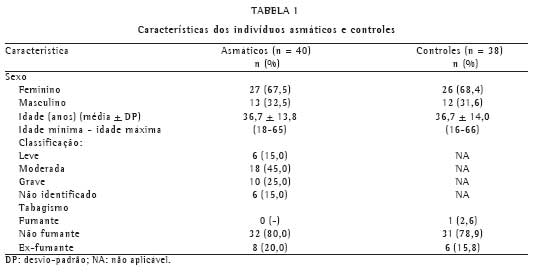 Avaliamos 78 pacientes ambulatoriais do Hospital das Clínicas da Faculdade de Medicina da Universidade de São Paulo, sendo 40 indivíduos asmáticos selecionados aleatoriamente na Clínica de Pneumologia e 38 controles selecionados na Clínica Médica. Os controles foram pareados por sexo e idade (± 2 anos), após exclusão daqueles que referiram história ou procura por atendimento por doenças cardiorrespiratórias e/ou alérgicas (asma e/ou eczema e/ou rinite). Tanto no grupo de asmáticos quanto no de controles não se admitiram fumantes ou ex-fumantes com mais de dez anos-maço.