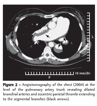 In April of 2004, the patient presented progressive functional worsening, reaching functional class IV. Angiotomography of the chest revealed eccentric parietal thrombi, predominantly in the pulmonary artery trunk (from the main branches to the subsegmental branches, bilaterally), with calcifications peripheral to the thrombi (Figure 2). There was also mosaic perfusion in the pulmonary parenchyma, together with bronchial artery dilatation. Tests for deep vein thrombosis and thrombophilia were negative. Despite the functional class worsening, the distance covered on the six-minute walk test (6MWT)-used to assess functional capacity-was 414 m, a dissociation that has previously been described in patients with IPAH.(7) The patient remained adequately anticoagulated throughout the treatment period. The tomographic images were fully consistent with the diagnosis of CTEPH. Fortunately, our knowledge of the previous diagnosis (IPAH) allowed us to opt for clinical treatment with 75 mg/day of sildenafil.
