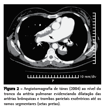 Em abril de 2004, apresentou piora funcional progressiva, chegando à classe funcional IV. A angiotomografia de tórax evidenciou trombos parietais excêntricos, de predomínio no tronco da artéria pulmonar (dos ramos principais até os ramos sub-segmentares, bilateralmente), com calcificações periféricas aos trombos (Figura 2). Apresentava ainda padrão de perfusão em mosaico no parênquima pulmonar e dilatação de artérias brônquicas. A investigação para trombose venosa profunda e trombofilias resultou negativa. Apesar da piora de classe funcional, a distância percorrida no teste de caminhada de seis minutos (TC6)-usado para avaliar a capacidade funcional-foi de 414 m; dissociação essa já descrita para pacientes com HAPI.(7) A paciente permaneceu todo o período de tratamento adequadamente anticoagulada. As imagens tomográficas eram totalmente compatíveis com o diagnóstico de HPTEPC. Felizmente, o conhecimento do diagnóstico prévio da paciente (HAPI) nos permitiu optar pelo tratamento clínico, com o uso de sildenafila 75 mg/dia. Houve ótima resposta clínica e retorno, após algumas semanas, à classe funcional II.