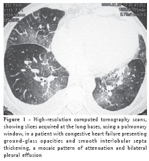 Thickening of the interlobular septa was a common finding accompanying hydrostatic edema, occurring in 100% of the patients and corresponding to the interstitial pathway for the drainage of excess pulmonary fluid. In thirteen patients (87%), the thickening was bilateral, whereas it was unilateral in two (13%). The interlobular septal thickening was smooth in all of the cases (100%). In another study(9) involving four patients, only one presented a nodular aspect, which was likely attributable to an increase in septal vein diameter. Nodular thickening of the interlobular septa is a common finding in a number of diseases, particularly in sarcoidosis and lymphangitic carcinomatosis.(16)
