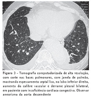 A presença de espessamento dos septos interlobulares foi um achado comum, associado ao edema hidrostático, ocorrendo em 100% dos pacientes, e correspondendo à via intersticial de drenagem do excesso de fluido pulmonar. Em 13 pacientes o achado foi bilateral (87%), e em dois foi unilateral (13%). O espessamento dos septos interlobulares teve aspecto liso em todos os casos (100%). Em outro estudo,(9) de quatro pacientes, somente um mostrou aspecto nodular, por provável aumento do calibre de veias septais. O espessamento nodular dos septos interlobulares é um achado freqüente em uma série de doenças, particularmente na sarcoidose e na linfangite carcinomatosa.(16)