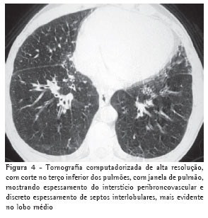 O espessamento septal não foi encontrado isoladamente. Em todos os casos em que estava presente havia também opacidades em vidro fosco, sendo que em 67% deles se configurava o aspecto em pavimentação em mosaico (10 casos). Em outro estudo,(9) o espessamento septal interlobular também não foi observado como achado tomográfico isolado. Sua presença estava intimamente relacionada à existência de espessamento do interstício peribroncovascular.