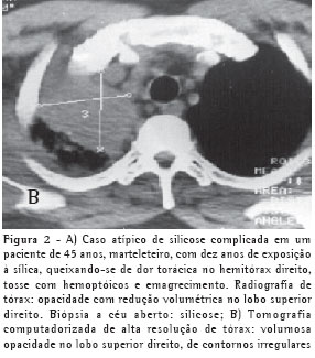 De todos os casos analisados (n = 75), apenas um apresentou grande opacidade unilateral simulando massa tumoral, sendo o diagnóstico de silicose feito através de toracotomia com biópsia pulmonar a céu aberto. Lesões solitárias de FMP são freqüentemente confundidas com câncer de pulmão. Considerando-se a maior incidência de câncer de pulmão nesses pacientes, é importante fazer uma abordagem diagnóstica para efetivamente diferenciar as lesões malignas das lesões benignas pneumoconióticas.(19)