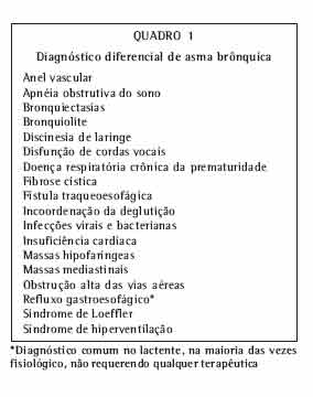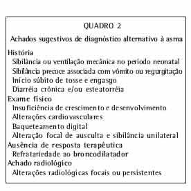 O Third International Pediatric Consensus Statement on the Management of Childhood Asthma(16) relata que a imunopatologia da asma em crianças menores de três anos de idade precisa ser melhor estudada. Considera que a ocorrência de episódios repetidos de sibilância e/ou tosse persistente, nessa faixa etária, sugere fortemente o diagnóstico de asma, desde que outras doenças causadoras de sibilância tenham sido excluídas. Os quadros 1 e 2 mostram, respectivamente, exemplos de diagnósticos alternativos e achados que sugerem esses diagnósticos(17).