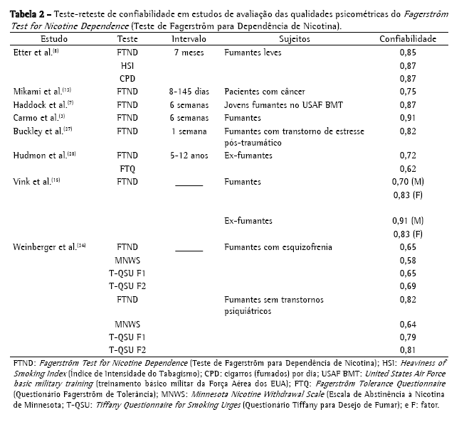 Entre os estudos sobre a confiabilidade do FTND, destaca-se o de Mikami et al.,(13) realizado no Japão, que envolveu uma amostra predominantemente de pacientes do gênero masculino com câncer de pulmão, de cérebro ou garganta. Nesse estudo, o coeficiente de correlação foi de 0,75, embora o tempo entre as aplicações não tenha sido relatado pelos autores. Em outro estudo, a confiabilidade do FTND foi comparada à do HSI em fumantes leves que haviam sido avaliados em um estudo de coorte anterior, durante sete meses.(8) A despeito do longo intervalo entre as avaliações, ambos os testes demonstraram ter alta confiabilidade, e um coeficiente (0,87) ligeiramente mais alto foi obtido com o HSI. Portanto, estes instrumentos podem ser usados a fim de avaliar não somente os fumantes pesados mas também os fumantes leves.