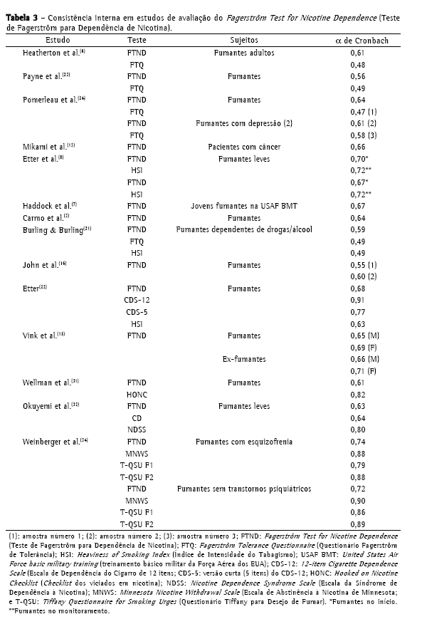 Consistência interna e análise fatorialIdentificamos quatorze estudos que avaliaram a consistência interna do FTND. Nesses estudos, o coeficiente alfa de Cronbach variou de 0,55 a 0,74, indicando que o FTND tem consistência interna moderada (Tabela 3).