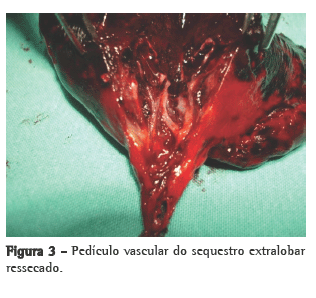 Os achados sugeriam fortemente a presença de um sequestro com torção e ruptura parcial do pedículo vascular e infarto do segmento pulmonar extralobar. A ressecção da lesão foi alcançada após a ligadura do pedículo vascular oriundo da artéria e veia intercostais. O segmento da veia intercostal anômala mostrava evidências de ruptura e colapso prévios (Figura 3), o que poderia explicar o sangramento. A cavidade pleural foi drenada com dreno tubular de calibre 28 French, retirado no segundo dia de pós-operatório.