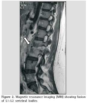 Diagnosis of intrapulmonary TB continues to be a challenge because the symptoms, usually insidious, can be mistakenly attributed to other causes. Spinal TB may be concomitant with pulmonary involvement, and occurs in less than 1% of patients. It is even rarer when there is no pulmonary alteration(14-17).The most common site of spinal TB infection is low thoracic and lumbar vertebrae, regardless of being primary or secondary to pulmonary TB(5). Infection of the lumbosacral junction is much rarer and occurs in only 2% to 3% of all cases of spinal TB(9-13).