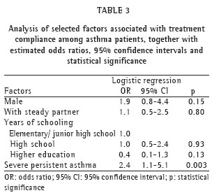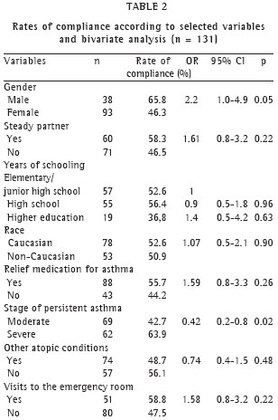 In the bivariate analysis, being male was found to be protective against noncompliance (OR: 2.2; 95% CI: 1.0 - 4.9; p = 0.05). However, this was not confirmed in the multivariate analysis. There was a higher rate of compliance among patients with severe persistent asthma than among those with moderate persistent asthma (the more severe the asthma, the higher the rate of compliance found, both in the bivariate analysis and in the logistic regression), and this difference was statistically significant (OR: 0.4; 95% CI: 0.2 - 0.8; p = 0.02 vs. OR: 2.4; 95% CI: 1.1 - 5.1; p = 0.03).