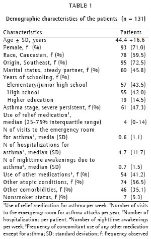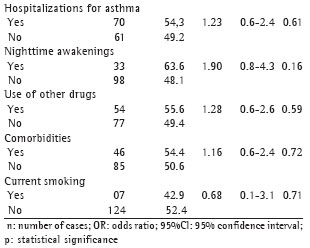 There were no statistically significant differences among any of the other variables studied (age; race; marital status; gender; years of schooling; smoking habits; concomitance with other atopic conditions; comorbidities; use of other medications; hospital admissions and visits to the emergency room for asthma; use of relief medication; and nighttime awakenings).