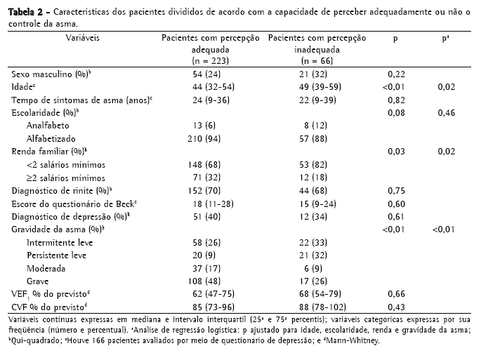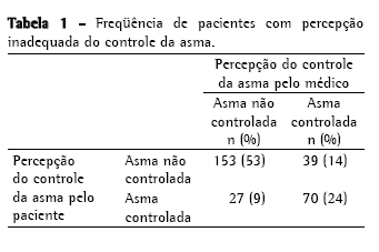 Objetivo: Estimar a proporção de pacientes asmáticos com percepção inadequada do controle dos sintomas e avaliar as características deste subgrupo. Métodos: Estudo transversal no qual foram selecionados pacientes ambulatoriais consecutivos com asma leve, moderada ou grave, maiores de 12 anos. Os pacientes foram submetidos a exame clínico, avaliação de depressão e da percepção do controle da asma e exame de função pulmonar. Foram realizadas avaliação da concordância quanto ao controle dos sintomas de asma entre médicos e pacientes e comparação entre as características dos pacientes com percepção adequada e inadequada do controle da asma. Resultados: A concordância entre médicos e pacientes quanto ao controle da asma foi baixa (índice kappa = 0,5). Dos 289 pacientes incluídos, 66 (23%) apresentaram percepção inadequada do controle da asma. A análise preliminar univariada revelou que os pacientes com percepção inadequada eram mais idosos, tinham menor renda familiar e apresentavam asma de menor gravidade. A análise multivariada não modificou os resultados. Não houve diferença entre os grupos quanto a sexo, freqüência de pacientes alfabetizados, tempo de sintomas de asma, diagnóstico de rinite, freqüência de depressão, função pulmonar ou adesão ao tratamento. Conclusões: A freqüência de percepção inadequada do controle da doença em pacientes com asma é elevada, principalmente em pacientes idosos, com baixa renda familiar e asma de menor gravidade.