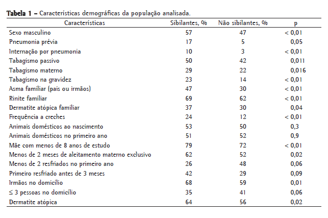 No período entre junho e dezembro de 2006, 1.013 lactentes foram incluídos na análise. A maioria era do sexo masculino (53%), e a média de idade foi de 13,5 ± 1,2 meses. No grupo entrevistado, 61% das crianças apresentaram pelo menos um episódio de sibilância e, daqueles, um terço repetiu o sintoma em pelo menos três ocasiões, caracterizando sua recorrência. A média de idade para o início dos episódios de sibilância foi de 5,16 meses (mediana, 5 meses). Em relação a sua gravidade, mais de 40% das crianças procuraram serviços de urgência em função do quadro de sibilância, e 17% tiveram pelo menos uma hospitalização por essa causa no primeiro ano de vida (Tabela 1).