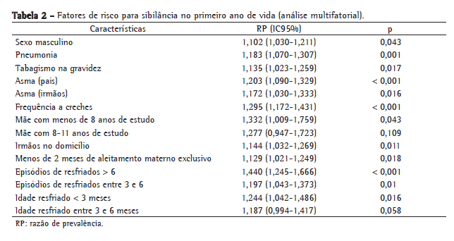 Na análise multivariada, foram encontrados os seguintes fatores de risco para a presença de sibilância no primeiro ano de vida: sexo masculino (57%), história de pneumonia (17%), tabagismo na gravidez (23%), frequência a creches (24%), baixo nível educacional materno (79%), desmame precoce (62%), número elevado de resfriados (21%), primeiro quadro viral antes dos 3 meses (40%), presença de irmãos (68%) e presença de familiar com asma (47%), tanto nos pais, quanto nos irmãos. Outros dados de alergia familiar, como rinite e dermatite, não atingiram significância estatística. Alguns fatores associados ao risco de sibilância no primeiro ano de vida, tais como exposição ambiental ao tabaco, mãe tabagista, hospitalização por pneumonia e dado pessoal de atopia (dermatite), apesar de apresentarem significância estatística na análise bivariada, não mantiveram essa significância no modelo de análise multivariada (Tabela 2).