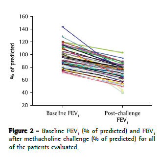All patients gave written informed consent, after which they were asked to report to the pulmonary function laboratory, where methacholine challenge testing was performed. A Koko spirometer (PDS Instrumentation Inc., Louisville, CO, USA) was used in order to carry out a five-breath dosimeter protocol, in accordance with the recommendations of the American Thoracic Society and the Brazilian Thoracic Association.(9,10) The Borg scale was applied in order to determine patient perception of the symptom of dyspnea. If baseline FEV1 was < 60% of predicted, the challenge test was not performed. After each dose of methacholine and immediately after pulmonary function measurement, the Borg scale was again applied. After methacholine challenge, inhaled albuterol (400 µg) was administered.