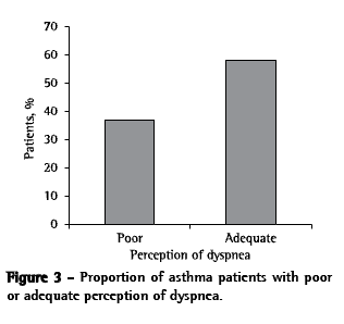 Treatment adherence and asthma control can be influenced by poor perception of bronchoconstriction. Patient ability to identify asthma control has a direct impact on the management of the disease by the physician, who makes decisions regarding treatment primarily on the basis of the symptoms reported. A study conducted under the auspices of the Bahia State Asthma and Allergic Rhinitis Control Program found that the degree of concordance between physicians and patients regarding the perception of asthma control is low. In that study, 23% of the patients had an inadequate perception of asthma control. Of those, most were elderly, had a low family income, and had less severe asthma.(7) Our data revealed no correlation between asthma control and the perception of dyspnea. There was, however, a tendency toward a lower proportion of patients with controlled asthma in the group of patients with poor perception, suggesting that poor perception of airway obstruction influences asthma control. Nevertheless, it is unknown whether this is a consequence or a cause of the poor perception.