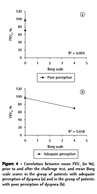 Using the correlations between the Borg scale scores and the fall in FEV1, we divided the patients into two groups: adequate perception and poor perception. We attempted to determine whether the perception of dyspnea correlated with the severity of acute bronchoconstriction, the severity of bronchial hyperresponsiveness, use of maintenance medication, and asthma control.