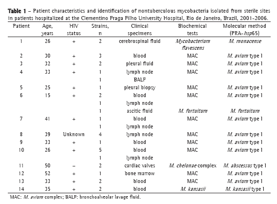 Objective: To identify nontuberculous mycobacteria (NTM) isolated from sterile sites in patients hospitalized between 2001 and 2006 at the Clementino Fraga Filho University Hospital, located in the city of Rio de Janeiro, Brazil. Methods: During the study period, 34 NTM isolates from sterile sites of 14 patients, most of whom were HIV-positive, were submitted to phenotypic identification and hsp65 PCR-restriction enzyme analysis (PRA). Results: Most isolates were identified as Mycobacterium avium, followed by M. monacense, M. kansasii, and M. abscessus. Conclusions: The combination of PRA, a relatively simple and inexpensive method, with the evaluation of a few phenotypic characteristics can allow NTM to be accurately identified in the routine of clinical laboratories.