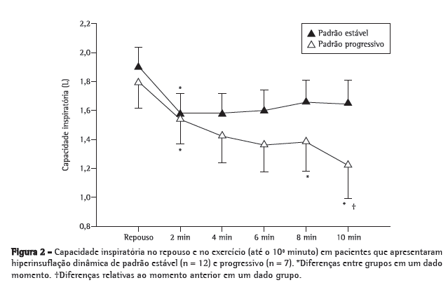 Objective: To characterize the presence, extent, and patterns of dynamic hyperinflation (DH) during treadmill exercise testing in patients with moderate to severe COPD. Methods: This was a cross-sectional study involving 30 non-hypoxemic patients (FEV1= 43 ± 14% of predicted) who were submitted to a cardiopulmonary exercise test on a treadmill at a constant speed (70-80% of maximum speed) to the tolerance limit (Tlim). Serial inspiratory capacity (IC) maneuvers were used in order to assess DH. Results: Of the 30 patients studied, 19 (63.3%) presented with DH (DH+ group), having greater pulmonary function impairment at rest than did those without DH (DH− group). None of the variables studied correlated with exercise tolerance in the DH− group, whereas Tlim, IC, and perception of dyspnea during exercise did so correlate in the DH+ group (p < 0.05). In the DH+ group, 7 and 12 patients, respectively, presented with a progressive and a stable pattern of DH (ΔICTlim,2min = −0.28 ± 0.11 L vs. 0.04 ± 0.10 L; p < 0.01). Patients with a progressive pattern of DH presented with higher perception of dyspnea/Tlim rate and lower exercise tolerance than did those with a stable pattern (354 ± 118 s and 465 ± 178 s, respectively; p < 0.05). Conclusions: The presence of DH is not a universal phenomenon during walking in COPD patients, even in those with moderate to severe airflow limitation. In the patients who presented DH, a progressive pattern of DH had a greater impact on exercise tolerance than did a stable pattern of DH.