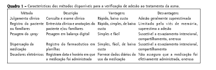 A seguir, é apresentada o Quadro 1 com as características gerais dos métodos disponíveis para se avaliar adesão ao tratamento da asma.
