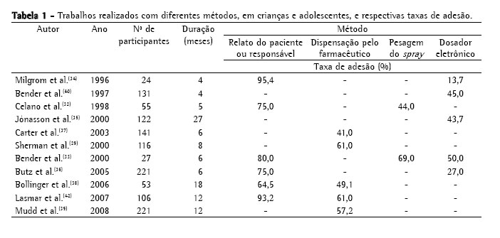 Bender et al. avaliaram 27 crianças em uso de corticóide inalatório, seguidas por seis meses, e encontraram uma taxa média de adesão de 80% segundo relato do responsável, 69% através da pesagem do spray e de 50% pelo Doser®.(33)