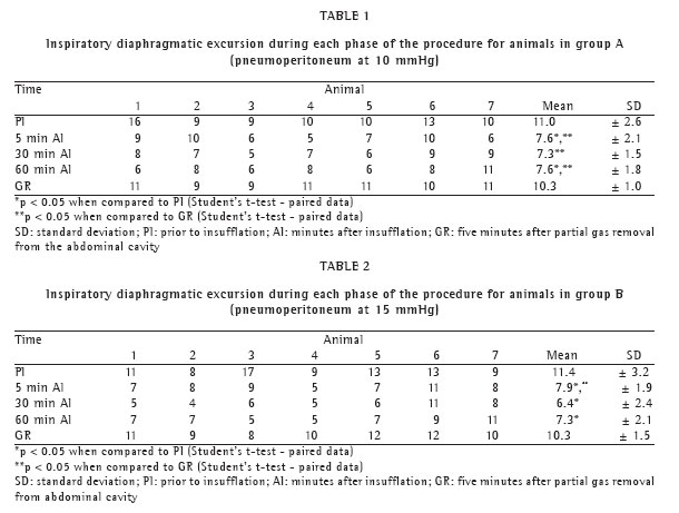 Therefore, the objective of this study was to evaluate the effects that two different IAP levels used to achieve pneumoperitoneum have on the amplitude of diaphragmatic excursion in pigs.