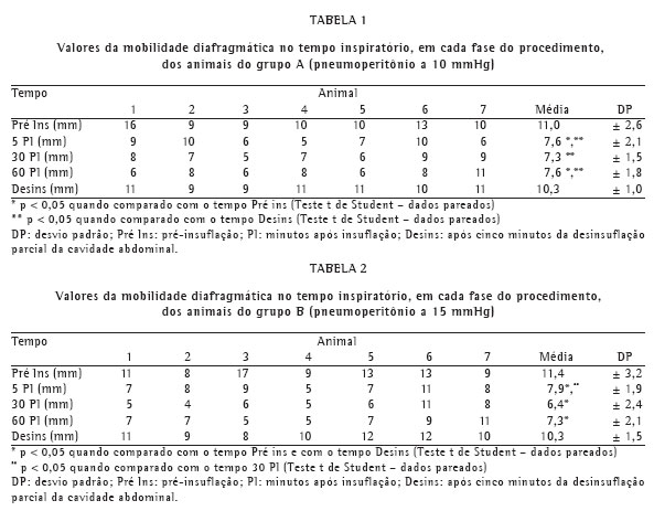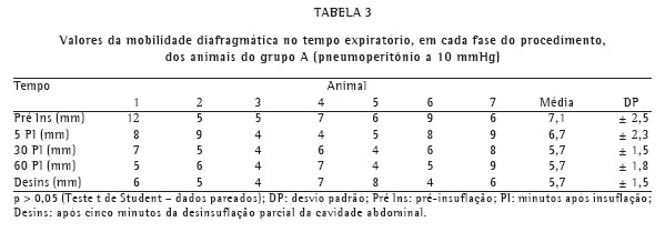 A indução anestésica foi determinada de tal forma que os animais pudessem permanecer intubados, porém em ventilação espontânea, para o controle do volume corrente. Este procedimento teve por objetivo facilitar o estudo da amplitude diafragmática pela ultra-sonografia, método seguro de análise não invasiva, uma vez que o comportamento ventilatório revela que a complacência pulmonar se reduz, gerando, conseqüentemente, o aumento da resistência das vias aéreas, com desigualdade na distribuição da ventilação para áreas pulmonares não dependentes, haja vista que a recomposição volumétrica traduz a estabilidade ventilatória. Estes resultados foram traduzidos em estudos que consideraram a idéia de independência para os valores pressóricos no que diz respeito à compressão volumétrica gerada pelo posicionamento cefálico do diafragma, pois ao se comparar os dois níveis de pressão (10 mmHg e 15 mmHg), a resposta não foi estatisticamente significativa, o que representou a readaptação volumétrica ao final do procedimento, ou seja, cinco minutos após a desinsuflação da cavidade abdominal, a qual perdurou por 60 minutos.(16-17)