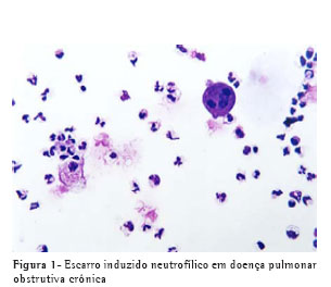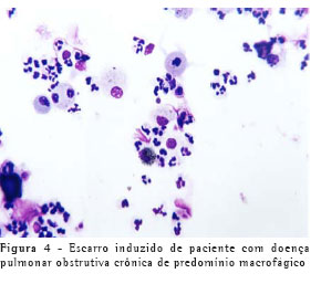 O eosinófilo é uma das células diretamente relacionadas à asma. Na DPOC, alguns trabalhos têm demonstrado a sua presença nas exacerbações, bem como nas fases de estabilidade da doença, através de biópsias, lavado broncoalveolar e escarro.(17-18) Pensava-se, inicialmente, que havia eosinófilos somente num subgrupo de DPOC, com comportamento clínico similar à asma, mas vários trabalhos têm enfatizado a presença de eosinófilos na agudização da DPOC (Figura 3).