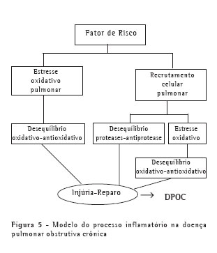 A idéia de que o enfisema resulta da lesão proteolítica dos septos alveolares tem se mantido como a teoria que mais se adapta aos conhecimentos adquiridos nestes últimos anos. Pela hipótese de desequilíbrio entre protease e antiprotease, ocorreria uma liberação episódica ou regular de proteinases no tecido pulmonar capaz de digerir as proteínas de sustentação da estrutura pulmonar. Normalmente, o pulmão é protegido pela ação de inibidores de proteases, principalmente provenientes do sangue, mas que também podem ser produzidos localmente. O enfisema resultaria num desequilíbrio da relação entre protease e antiprotease, favorecendo as proteases. O reparo pulmonar seria feito de forma insuficiente e deficiente e logo mudanças funcionais poderiam ser verificadas. É evidente que os fatores de risco já determinados seriam os principais determinantes do início do processo inflamatório celular e do estresse oxidativo. Quando associados a uma predisposição genética, levariam a uma disfunção das células inflamatórias, como os linfócitos T CD8+ e os macrófagos, que se manteriam ativados no tecido pulmonar, acarretando progressiva destruição parenquimatosa e tendo como conseqüência final a DPOC (Figura 5).