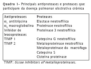 A a1-antitripsina é uma glicoproteína de 52kDa sintetizada primariamente pelo fígado; consiste em uma cadeia de polipeptídeo de 394 aminoácidos, e possui atividade de inibição proteolítica da elastase neutrofílica e de outras proteinases. Em 1963, alguns autores(27) propuseram uma associação entre a deficiência sérica de a1-antitripsina e enfisema, originando uma teoria de desbalanço entre proteinase e antiproteinase para a gênese da DPOC. A sua deficiência genética traduz-se em enfisema pulmonar em jovens não fumantes (Quadro 1).