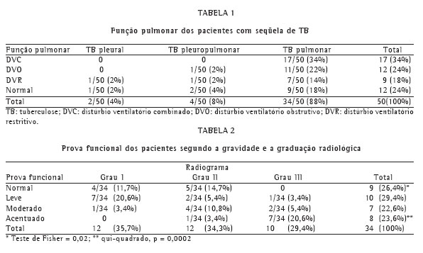 Objective: To describe data related to the pulmonary function of patients with sequelae of pulmonary tuberculosis, pleural tuberculosis or both. Methods: In the outpatient clinic of a university hospital, 218 patients were evaluated. Of those 218, 56 had sequelae of tuberculosis (pulmonary, pleural or both), and 162 had other types of tuberculosis. All patients were evaluated in the pulmonary function laboratory between February 2000 and July 2004, and 43 were found to be eligible for inclusion in the study. Patients with a history of asthma, chronic pulmonary obstructive disease, cardiac insufficiency, collagen diseases, silicosis or thoracic surgery, as well as those for whom spirometry yielded unacceptable results or was not performed, were excluded. The lung fields were divided into six zones, and radiographic results were classified by degree: I (involvement of only one zone with no cavitation); II (involvement of two or three zones or of one zone with cavitation); or III (extensive involvement of three or more zones with or without cavitation). Results: The final study sample comprised 50 patients, 44 (88%) of whom had pulmonary tuberculosis. The most prevalent form (17/50; 34%) was mixed ventilatory disturbance. Severe disturbances were more significant in degree III radiographs (p = 0.0002) and normal pulmonary function was predominant among patients presenting degree I and II radiographs (p = 0.002). Conclusion: The early discovery and treatment of tuberculosis contribute to reduce the number of cases, as well as the incidence of tuberculosis sequelae, thereby improving the quality of life of tuberculosis patients. Further studies, involving longitudinal, sequential analysis and larger samples of patients with tuberculosis sequelae, should be conducted in referral centers in Brazil.