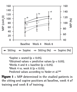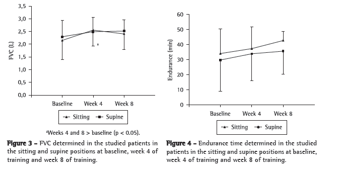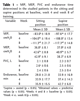 In the present study, MIP, MEP, FVC, and endurance obtained in the sitting position were compared with those in the supine position. A difference between the two positions was found for MIP at baseline, suggesting that the sitting position is disadvantageous for these patients.(24-26) However, this difference between the sitting and supine positions did not persist after 4 and 8 weeks of training, possibly due to the fact that the sitting position was adopted during the training sessions, thus minimizing any disadvantages for these patients.