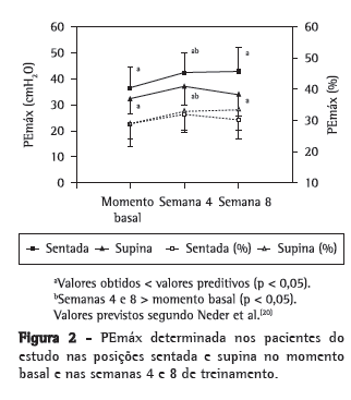 No presente estudo, PImáx, PEmáx, CVF e endurance obtidas na posição sentada foram comparadas às obtidas na posição supina. Encontrou-se uma diferença na PImáx no momento basal entre as duas posições, sugerindo que a posição sentada é desvantajosa para esses pacientes.(24-26) Entretanto, essa diferença entre as posições sentada e supina não persistiu após 4 e 8 semanas de treinamento, provavelmente devido ao fato de que a posição sentada foi adotada durante as sessões de treinamento, minimizando assim quaisquer desvantagens para esses pacientes.
