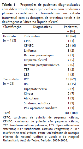 ResultadosNa Tabela 1, encontram-se a distribuição dos diagnósticos que causaram os exsudatos (em 152 pacientes) ou transudatos (em 29 pacientes) nos casos estudados.