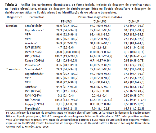 Para esse fim, o critério proposto por Light et al.,(1) em 1972, vem sendo empregado, apresentando boa sensibilidade, mas sem que a especificidade alcance o mesmo índice. O critério clássico mencionado caracteriza como exsudato o líquido pleural que apresenta a relação entre o valor de proteínas totais do líquido pleural (PT-LP) e o valor de proteínas totais do plasma que seja maior que 0,5; desidrogenase lática no líquido pleural (DHL-LP) > 200 U/L; e com relação de DHL no líquido pleural/soro > 0,6. Posteriormente, a dosagem da DHL-LP acima de dois terços daquela encontrada no soro passou também a ser considerada como indicativa de exsudato.