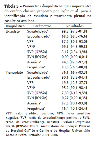 A Tabela 3 resume os parâmetros diagnósticos mais importantes do critério clássico proposto por Light et al. para a identificação de exsudato e transudato pleural na casuística avaliada. Neste caso, as dosagens de PTN e DLH foram utilizadas como testes múltiplos em paralelo para o índice total de diagnóstico.