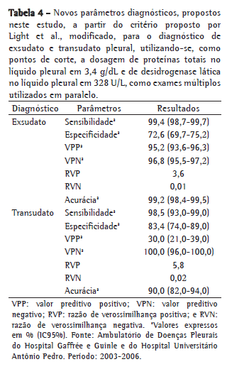 Após os exames múltiplos de PT-LP e DLH-LP serem utilizados em paralelo, os novos parâmetros diagnósticos propostos neste estudo, a partir do critério proposto por Light et al., modificado, para o diagnóstico de exsudato e transudato pleural, estão apresentados na Tabela 4.