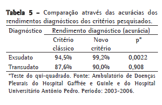 Por fim, comparamos a acurácia do novo critério proposto (dosagem isolada de PTN-L e DHL-LP) com a acurácia do critério clássico em nossa casuística (Tabela 5). Obtivemos, com o novo critério proposto para detecção de exsudatos, um rendimento diagnóstico significativamente superior ao do critério clássico. Entretanto, para a detecção de transudatos, não foram detectadas diferenças significativas entre as duas abordagens.
