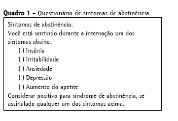 Se o paciente referisse ser tabagista atual, era questionado sobre a carga tabágica, grau de dependência à nicotina pelo teste de Fagerström,(10) questionário de sintomas respiratórios derivado do 2006 Global Initiative for Chronic Obstructive Lung Disease,(11) questionário de sintomas de abstinência utilizado no ambulatório de tabagismo do HSPE-SP, modificado de West (Quadro 1)(12) e mensuração de monóxido de carbono no ar expirado (COex) por técnica padronizada (aparelho Micro Medical Ltd., Rochester, Kent, Reino Unido). Valores acima de 6 ppm de COex foram considerados significantes para tabagismo recente.(13,14)